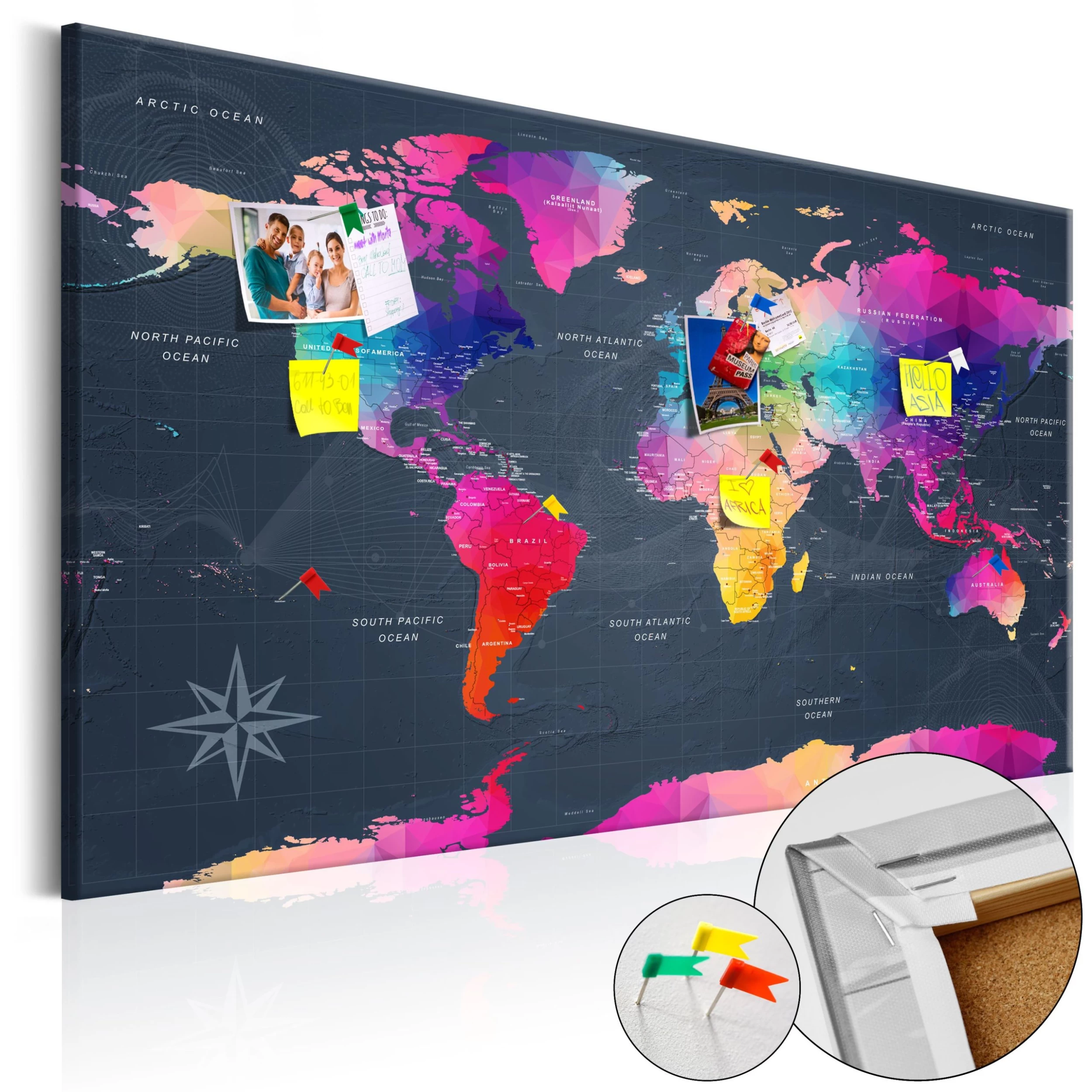 Afbeelding op kurk “Afbeelding op kurk – Colourful Crystals [Cork Map]” is veel lichter dan traditionele wanddecoratie. Zo kunnen prikborden worden opgehangen op iedere willekeurige plaats thuis of op kantoor. Het bedrukte doek wordt aangebracht op de kurkplaat. Zo krijgt de print duidelijke kleuren en geeft het de kleinste details weer. Prik er punaises of notities in en creëer zo je individuele ontwerp op de muur!