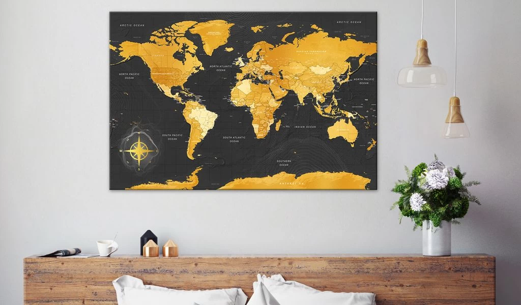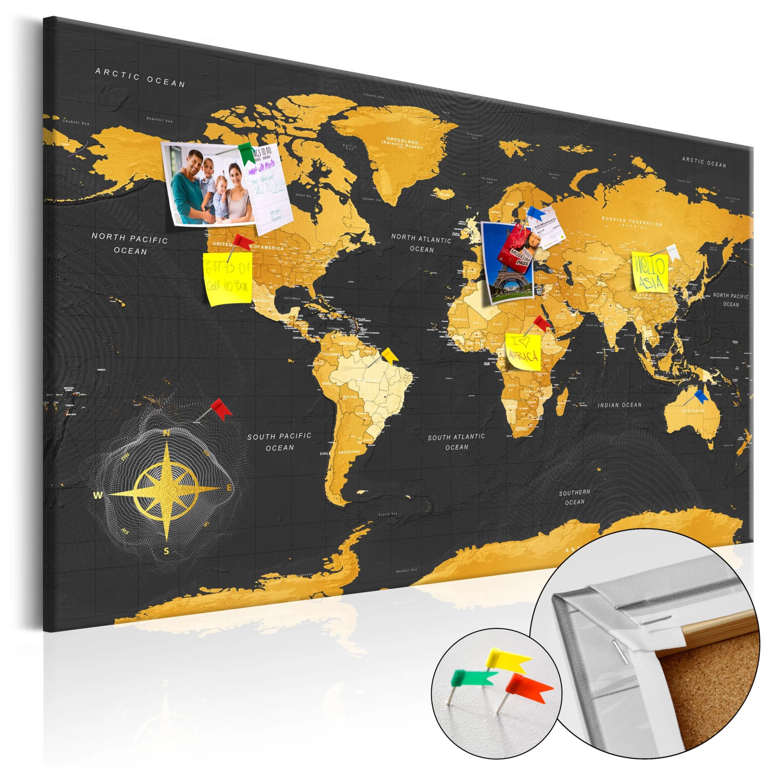Afbeelding op kurk “Afbeelding op kurk – Golden World [Cork Map]” is veel lichter dan traditionele wanddecoratie. Zo kunnen prikborden worden opgehangen op iedere willekeurige plaats thuis of op kantoor. Het bedrukte doek wordt aangebracht op de kurkplaat. Zo krijgt de print duidelijke kleuren en geeft het de kleinste details weer. Prik er punaises of notities in en creëer zo je individuele ontwerp op de muur!