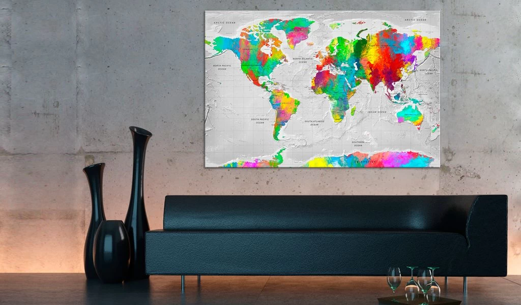 Afbeelding op kurk “Afbeelding op kurk – Maps: Colourful Finesse [Cork Map]” is veel lichter dan traditionele wanddecoratie. Zo kunnen prikborden worden opgehangen op iedere willekeurige plaats thuis of op kantoor. Het bedrukte doek wordt aangebracht op de kurkplaat. Zo krijgt de print duidelijke kleuren en geeft het de kleinste details weer. Prik er punaises of notities in en creëer zo je individuele ontwerp op de muur!