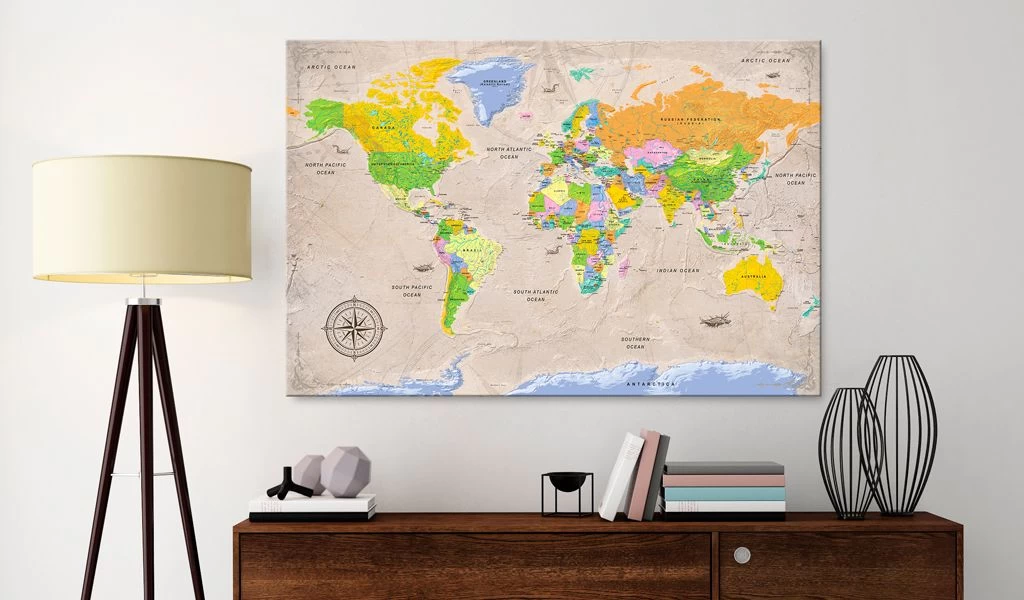 Afbeelding op kurk “Afbeelding op kurk – Maps: Vintage Style [Cork Map]” is veel lichter dan traditionele wanddecoratie. Zo kunnen prikborden worden opgehangen op iedere willekeurige plaats thuis of op kantoor. Het bedrukte doek wordt aangebracht op de kurkplaat. Zo krijgt de print duidelijke kleuren en geeft het de kleinste details weer. Prik er punaises of notities in en creëer zo je individuele ontwerp op de muur!