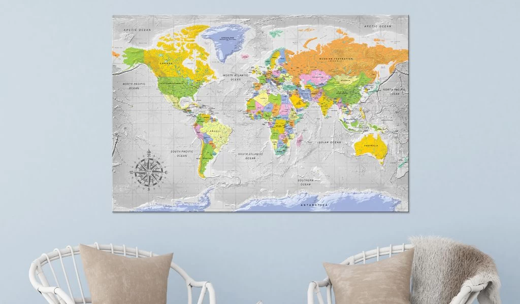 Afbeelding op kurk “Afbeelding op kurk – World Map: Wind Rose [Cork Map]” is veel lichter dan traditionele wanddecoratie. Zo kunnen prikborden worden opgehangen op iedere willekeurige plaats thuis of op kantoor. Het bedrukte doek wordt aangebracht op de kurkplaat. Zo krijgt de print duidelijke kleuren en geeft het de kleinste details weer. Prik er punaises of notities in en creëer zo je individuele ontwerp op de muur!