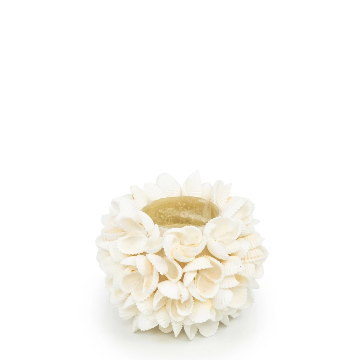 Deze mooie kust waxinelichthouder is handgemaakt met schelpen en heeft een mooi bloemenpatroon. Heerlijk om een gezellig boho lichtje te creëren waar u maar wilt.