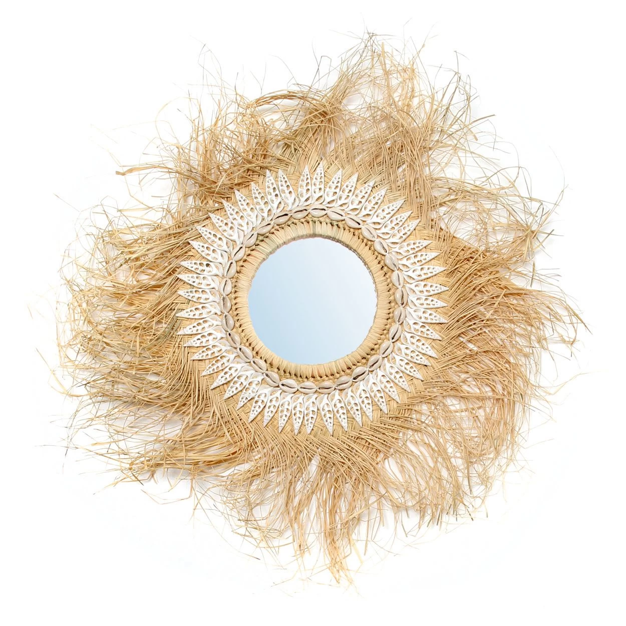 Deze prachtige spiegel brengt een vleugje kusttextuur in uw huis. Gemaakt van prachtig gras rondom een spiegelcentrum. Meer dan ooit trendy, brengt het een prachtige aardse boho touch aan uw interieur.