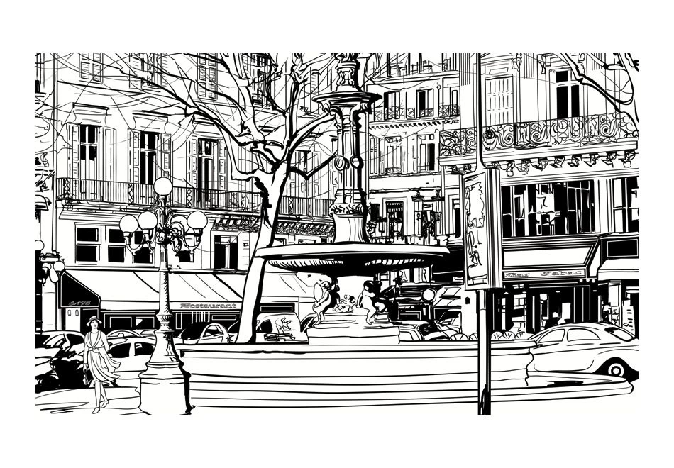 Bekijk hoe je het fotobehang “Fotobehang – Sketch of parisian fountain” stap voor stap monteert.