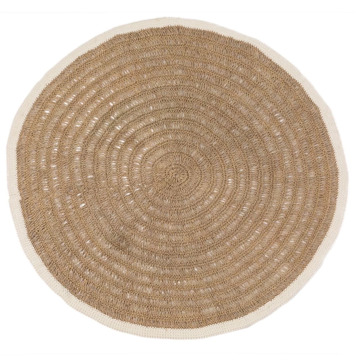 Ons ronde tapijt van zeegras en katoen is een absolute must voor uw huis. Het geeft textuur en zachtheid aan een harde vloer en creëert een visueel accent met de witte katoenen rand. Natuurlijk slijtvast, ideaal voor uw keuken, woonkamer of overdekt terras.