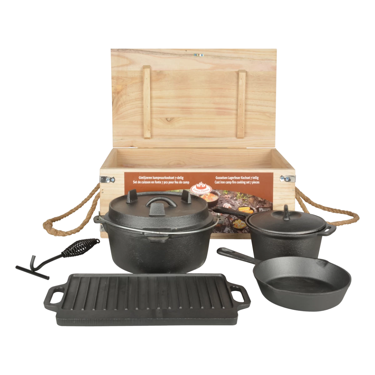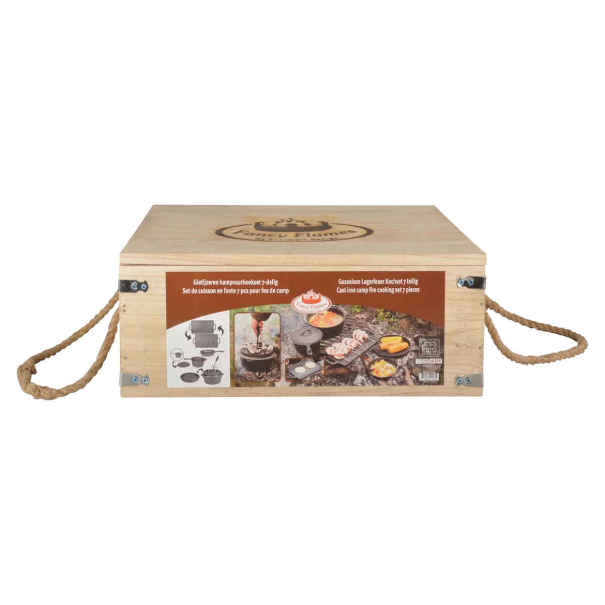 Buiten koken boven het vuur is een belevenis, een avontuur. Maak de heerlijkste gerechten klaar met deze complete 7-delige set, bestaande uit kampvuurpot, koekenpan met schenktuit, omkeerbare grillplaat met handgrepen, saus steelpan met deksel en dekselhaak. Al deze onderdelen zijn verpakt in een houten krat die is voorzien van handgrepen van touw, zodat het meenemen van de set makkelijk is. Tegelijkertijd biedt het krat ruimte voor extra kookgerei.