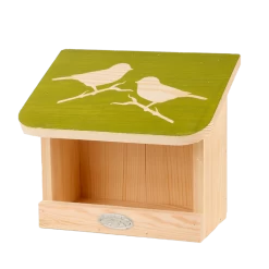 Deze functionele muurvoedertafel heeft een aantal praktische eigenschappen. (Her)vullen gaat eenvoudig door het dak op te tillen. De opstaande rand fungeert als zitstok, waardoor er een aparte voerbak ontstaat. Zo wordt de kans op ziektes verkleind.