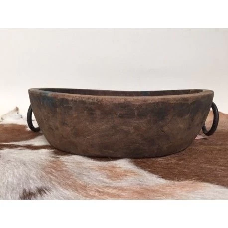 Robuuste schaal met ronde metalen hengsels Diameter 42 cm en hoogte 12 cm.