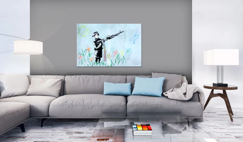 Laat de canvas print “Schilderij – Boy with Gun by Banksy” uw woning en de woningen van uw dierbaren veranderen!