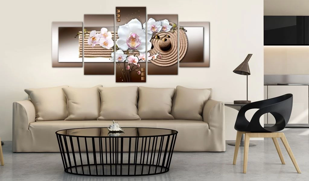 Laat de canvas print “Schilderij – Orchid and zen garden” uw woning en de woningen van uw dierbaren veranderen!