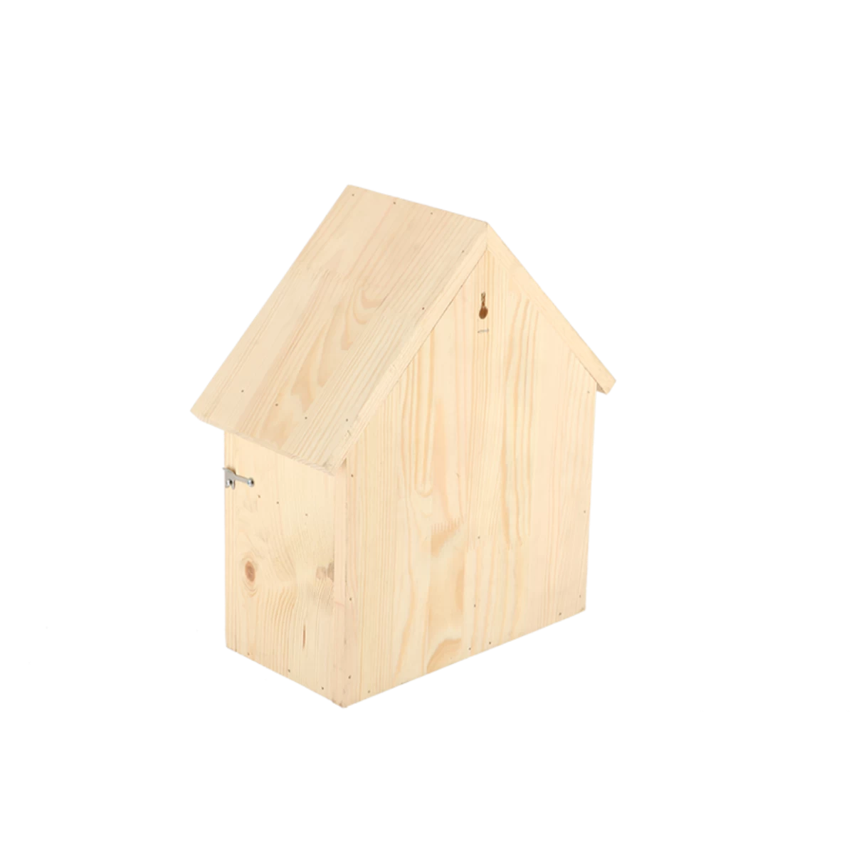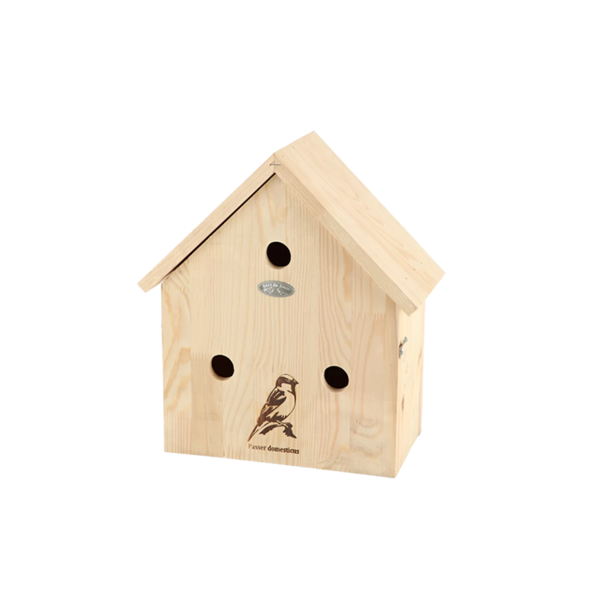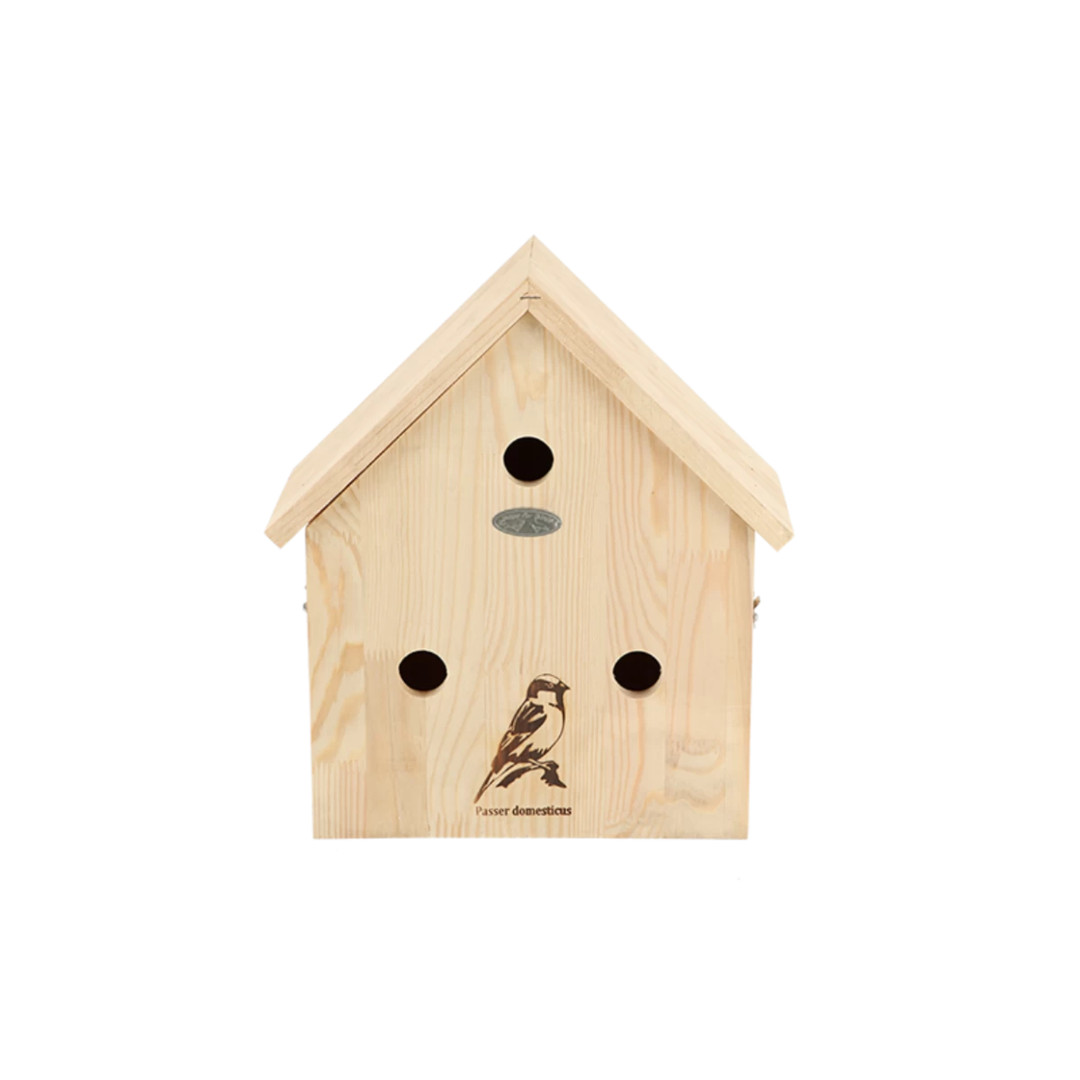 Deze mussenflat heeft drie woningen omdat mussen graag bij elkaar zitten. Behalve de huismus kunt u in deze kast ook de ringmus, koolmees en pimpelmees als bewoner verwachten.
