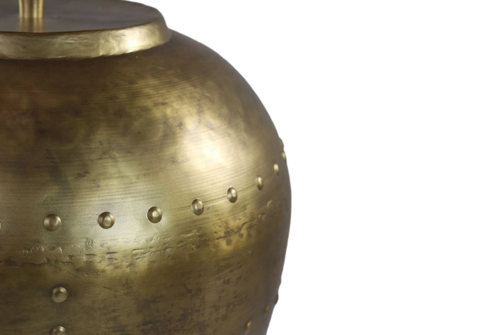Deze prachtige tafellamp is gemaakt van metaal en heeft een dopjes patroon (nagels), wat de lamp een bijzondere uitstraling geeft. De schakelaar zit op het snoer en de lamp wordt geleverd zonder lampenkap. De fitting is flexibel, waardoor de lampenkap kan worden versteld. Het gouden design van deze lamp past perfect in ieder interieur!