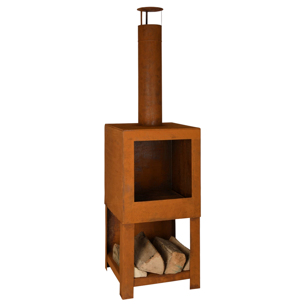 Terraskachel met houtopslag roest. Deze strak vormgegeven terraskachel beschikt over een houtopslag onder kachel.