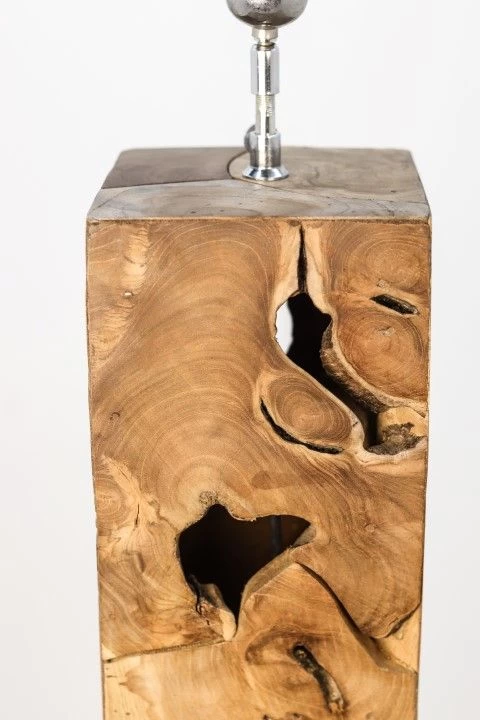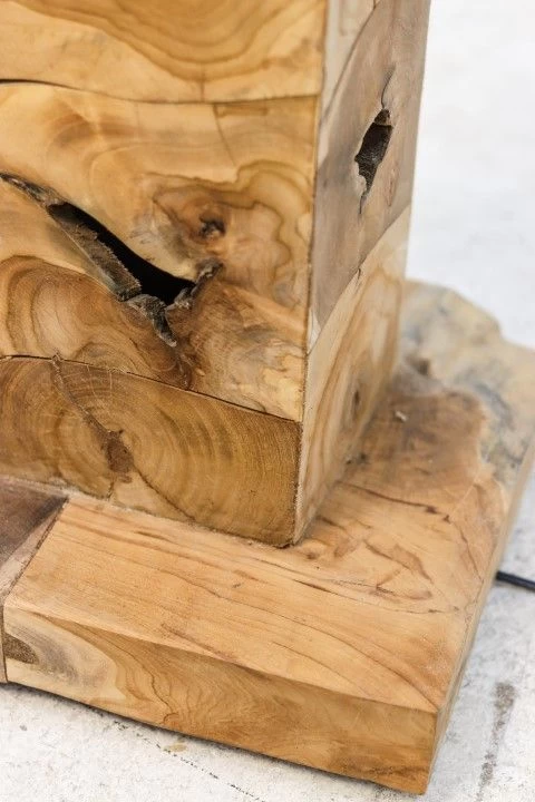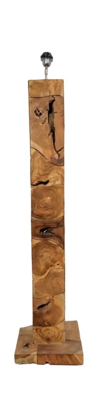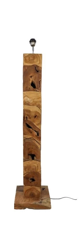 Deze staande vloerlamp van De Kistenkoning is de blikvanger in elke kamer. De staande lamp is gemaakt van meerdere stukken teakhout, die kundig bij elkaar zijn gevormd. De vloerlamp heeft een diameter van 15 cm en staat op een 30×30 cm basis.