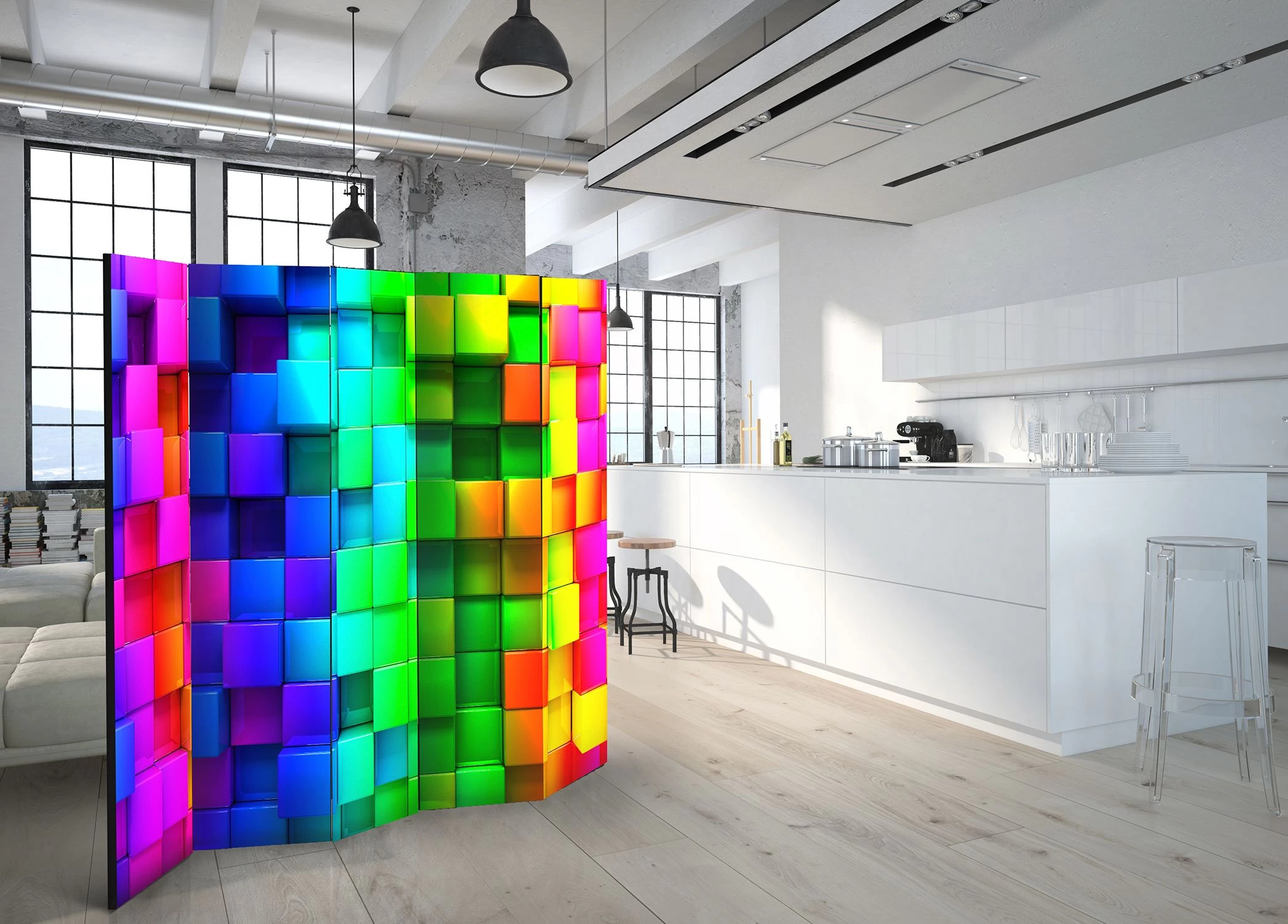 Het decoratieve vouwscherm “Vouwscherm – Colourful Cubes II [Room Dividers]” past uitzonderlijk mooi in een modern interieur. Het houten tweezijdig bedrukte vouwscherm geeft niet alleen een mooie opdeling van een ruimte maar geeft ook een fantastische flair aan uw interieur. De perfectie uitvoering en het originele motief in full HD uitvoering zorgen ervoor dat de kamervouwschermen iedere ruimte een originele charme verschaffen. Een prachtig kamervouwscherm is een zeer originele versiering en kan bijvoorbeeld prima worden toegepast in woningen of dienstruimten. (kapsalon, dokterskliniek, administratiekantoor etc)