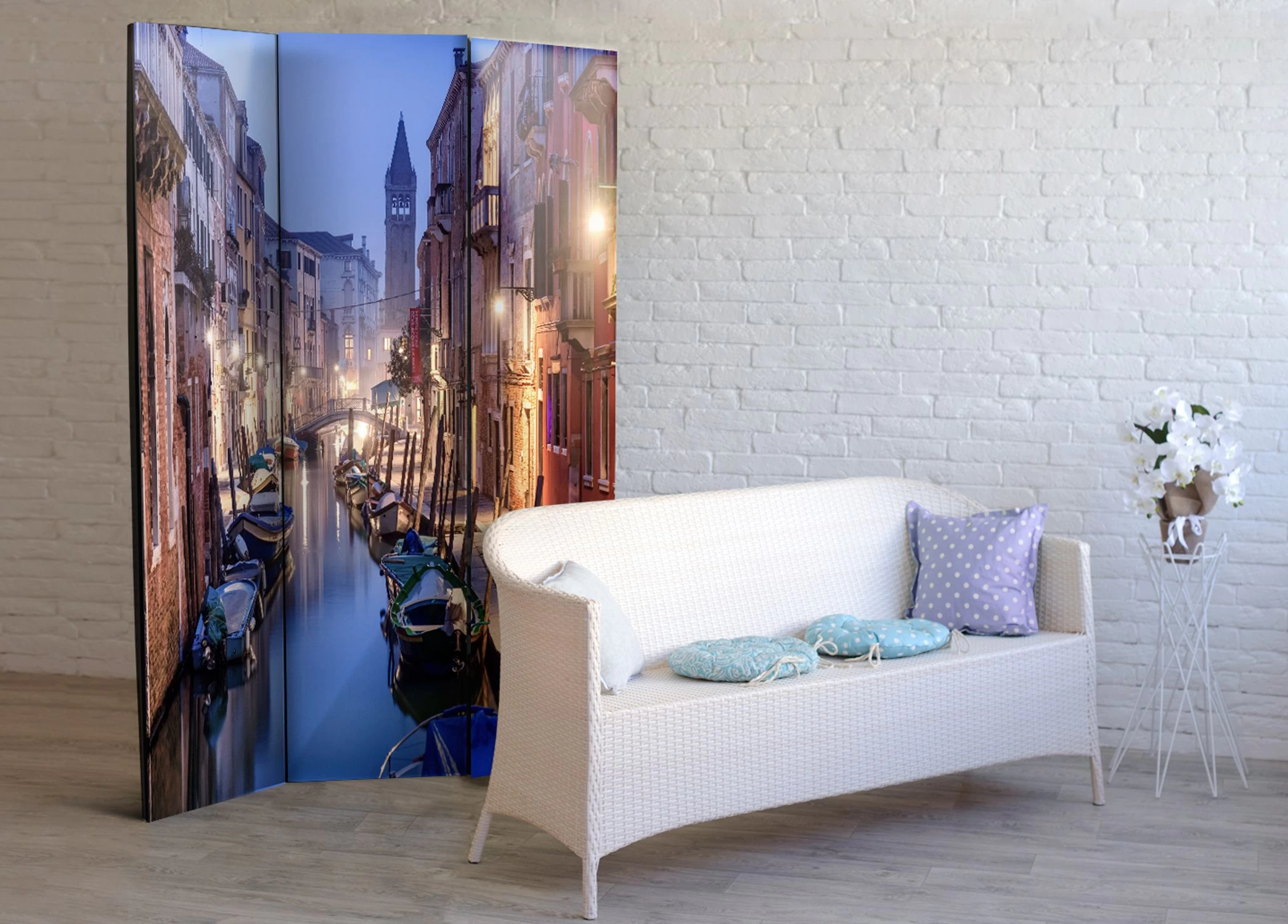 Het decoratieve vouwscherm “Vouwscherm – Evening in Venice [Room Dividers]” past uitzonderlijk mooi in een modern interieur. Het houten driedelige en tweezijdig bedrukte vouwscherm geeft niet alleen een mooie opdeling van een ruimte maar geeft ook een fantastische flair aan uw interieur. De perfectie uitvoering en het originele motief in full HD uitvoering zorgen ervoor dat de kamervouwschermen iedere ruimte een originele charme verschaffen. Een prachtig kamervouwscherm is een zeer originele versiering en kan bijvoorbeeld prima worden toegepast in woningen of dienstruimten. (kapsalon, dokterskliniek, administratiekantoor etc)