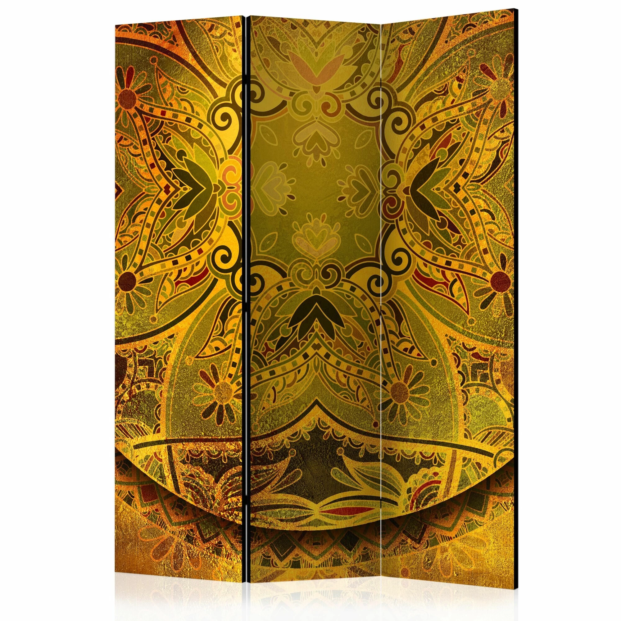 Het decoratieve vouwscherm “Vouwscherm – Mandala: Golden Power [Room Dividers]” past uitzonderlijk mooi in een modern interieur. Het houten driedelige en tweezijdig bedrukte vouwscherm geeft niet alleen een mooie opdeling van een ruimte maar geeft ook een fantastische flair aan uw interieur. De perfectie uitvoering en het originele motief in full HD uitvoering zorgen ervoor dat de kamervouwschermen iedere ruimte een originele charme verschaffen. Een prachtig kamervouwscherm is een zeer originele versiering en kan bijvoorbeeld prima worden toegepast in woningen of dienstruimten. (kapsalon, dokterskliniek, administratiekantoor etc)
