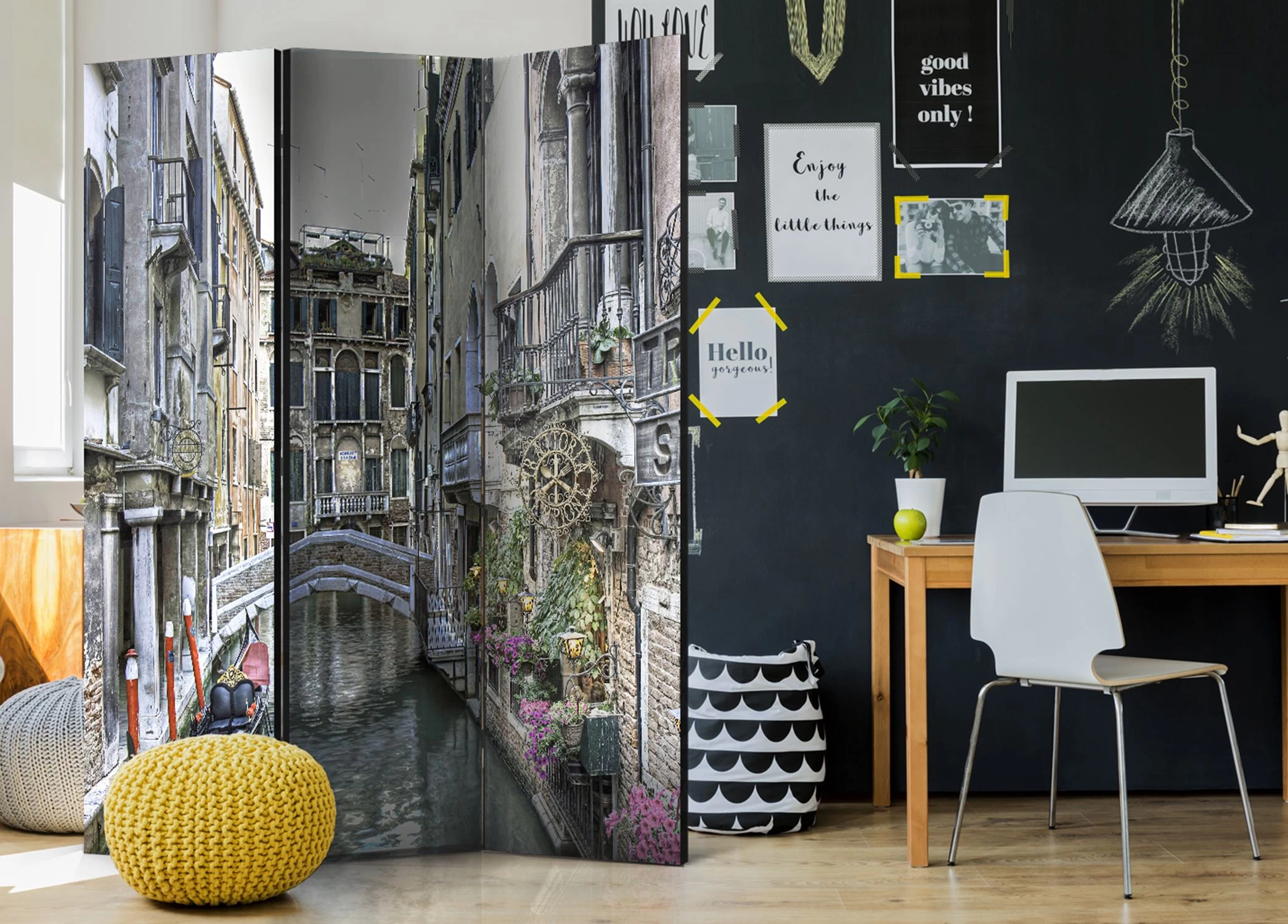 Het decoratieve vouwscherm “Vouwscherm – Romantic Venice [Room Dividers]” past uitzonderlijk mooi in een modern interieur. Het houten driedelige en tweezijdig bedrukte vouwscherm geeft niet alleen een mooie opdeling van een ruimte maar geeft ook een fantastische flair aan uw interieur. De perfectie uitvoering en het originele motief in full HD uitvoering zorgen ervoor dat de kamervouwschermen iedere ruimte een originele charme verschaffen. Een prachtig kamervouwscherm is een zeer originele versiering en kan bijvoorbeeld prima worden toegepast in woningen of dienstruimten. (kapsalon, dokterskliniek, administratiekantoor etc)