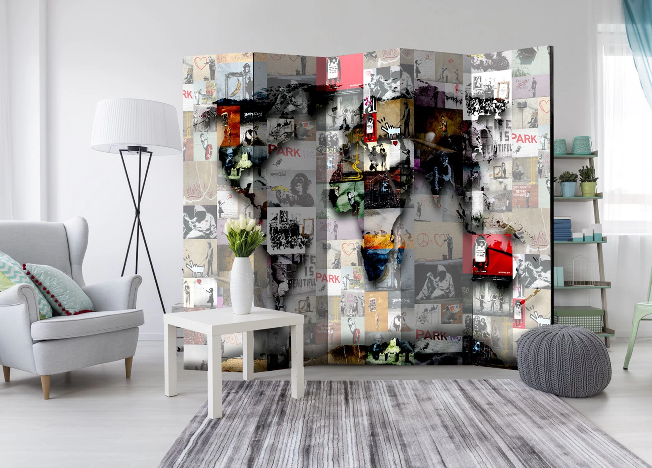 Het decoratieve vouwscherm “Vouwscherm – Room divider – World map – Banksy” past uitzonderlijk mooi in een modern interieur. Het houten tweezijdig bedrukte vouwscherm geeft niet alleen een mooie opdeling van een ruimte maar geeft ook een fantastische flair aan uw interieur. De perfectie uitvoering en het originele motief in full HD uitvoering zorgen ervoor dat de kamervouwschermen iedere ruimte een originele charme verschaffen. Een prachtig kamervouwscherm is een zeer originele versiering en kan bijvoorbeeld prima worden toegepast in woningen of dienstruimten. (kapsalon, dokterskliniek, administratiekantoor etc)