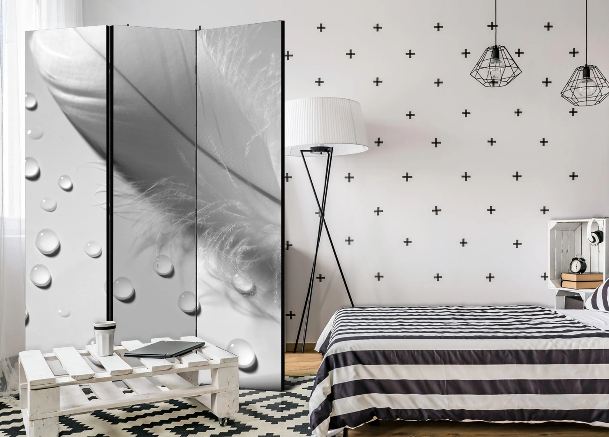 Het decoratieve vouwscherm “Vouwscherm – White Feather [Room Dividers]” past uitzonderlijk mooi in een modern interieur. Het houten driedelige en tweezijdig bedrukte vouwscherm geeft niet alleen een mooie opdeling van een ruimte maar geeft ook een fantastische flair aan uw interieur. De perfectie uitvoering en het originele motief in full HD uitvoering zorgen ervoor dat de kamervouwschermen iedere ruimte een originele charme verschaffen. Een prachtig kamervouwscherm is een zeer originele versiering en kan bijvoorbeeld prima worden toegepast in woningen of dienstruimten. (kapsalon, dokterskliniek, administratiekantoor etc)