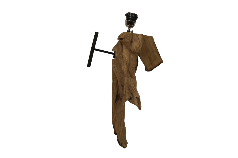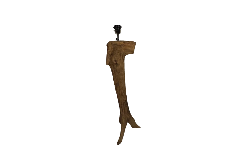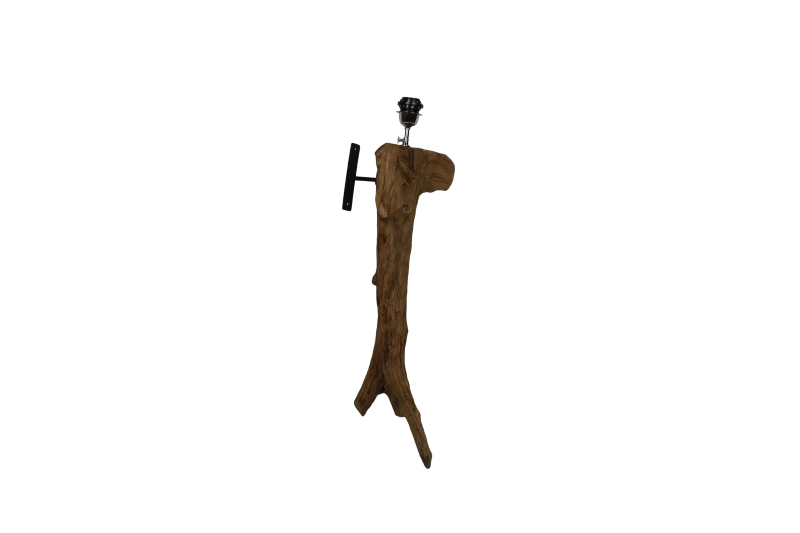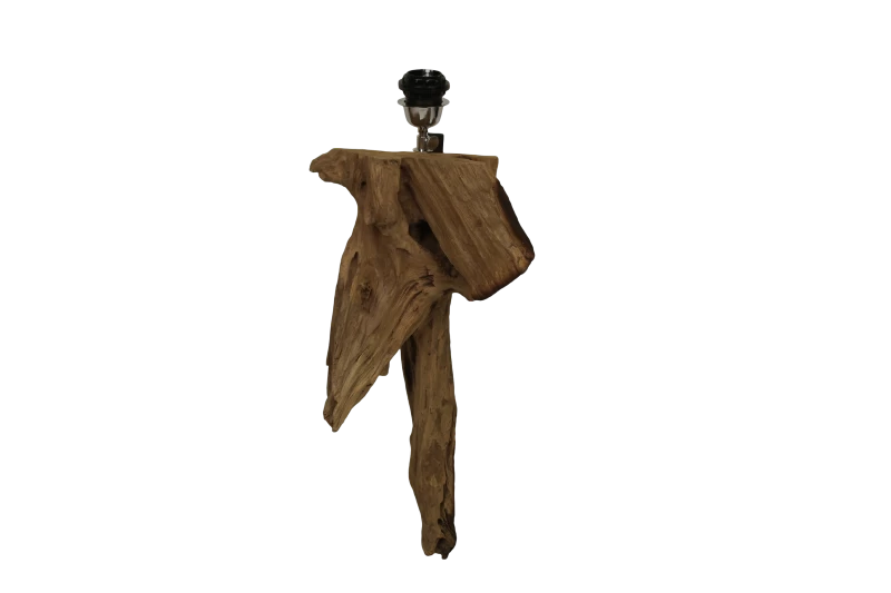 gemaakt van teakhout, en komt als het ware rechtstreeks van de boom. Met dit meubel geef je toch een bijzondere touch aan je huis. De lamp heeft een E27-fitting en een zwart snoer met een kunststof schakelaar. Een lichtbron en lampenkap worden niet